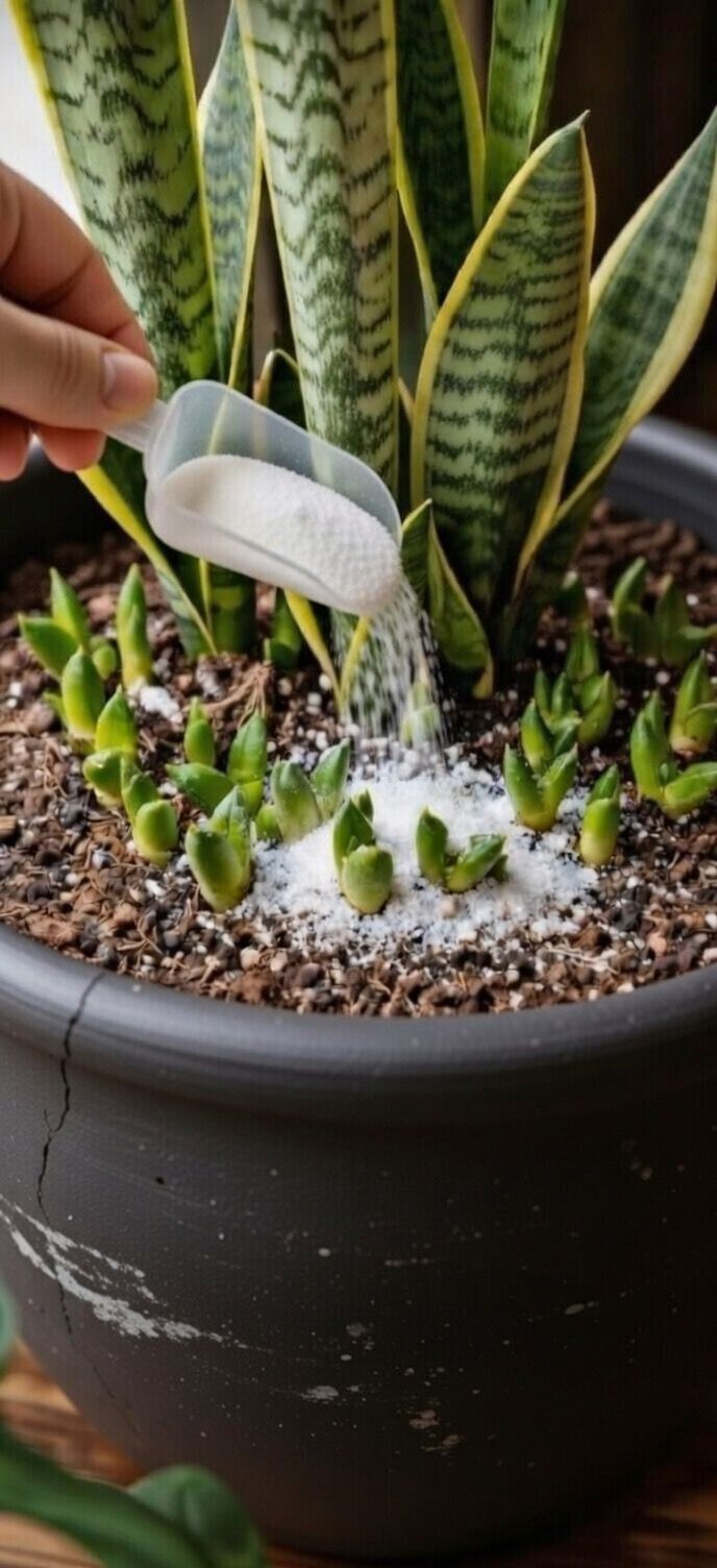 That’s why the “white powder trick” became popular among indoor plant lovers. Some claim it helps snake plants produce more pups faster.